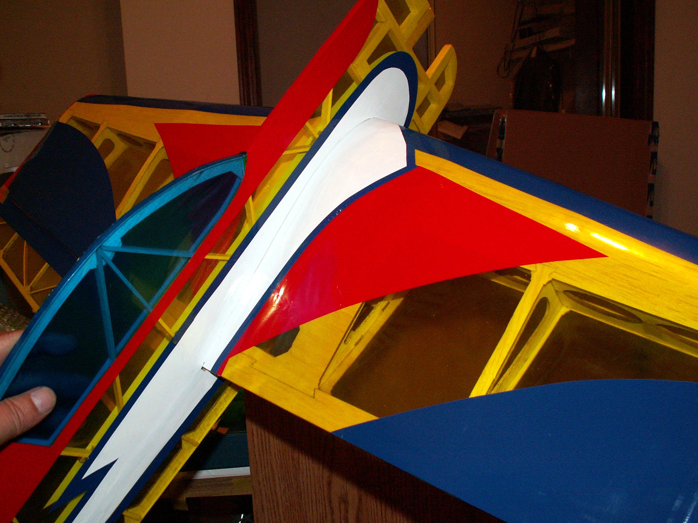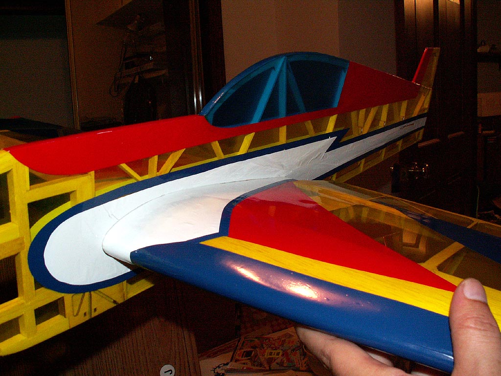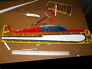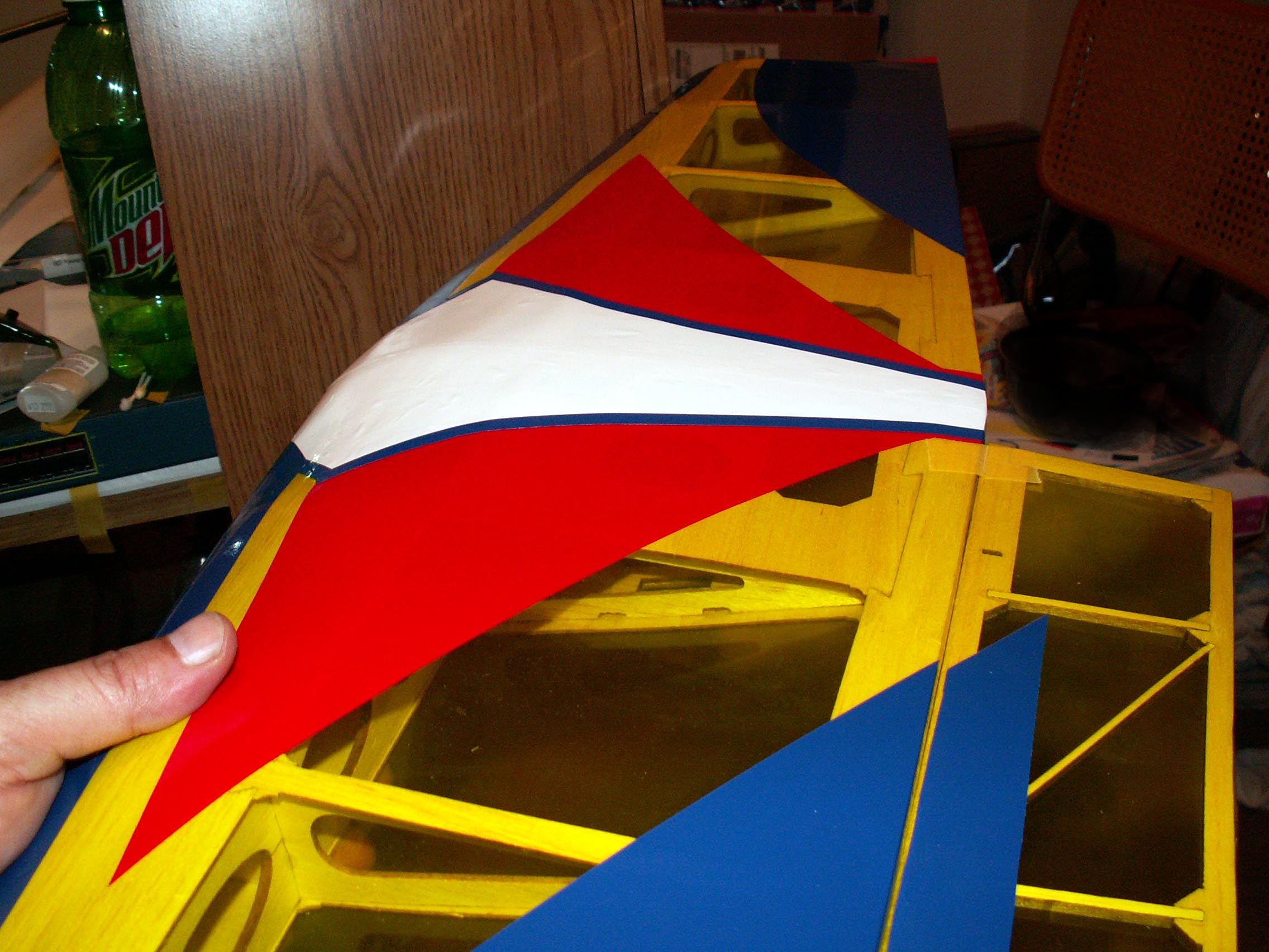 Assembly went fairly well. Quique's larger Yak's have white trim on the wing and fuselage... which really makes the colorscheme "pop". So, I added it to mine... regular ultracote white. The rest of the covering is probably "China-Kote". The yellow transparent is thicker than Ultracote-lite... and thicker than the covering that is on my EF Yak (same chinese factory made both planes). This yellow also seems to have memory... removing twists result in the twists returning in a couple days. The yellow also doesn't seem to want other covering sticking to it. When I installed the white trim, I noticed the blue and red trim was loose (not attached well) in several places. So, I went over all the trim with the iron on about 195F. Not enough to shrink it, but plenty to seemingly activate the adhesive. However, in a few days the trim was loose again. I recommend trim sealent.