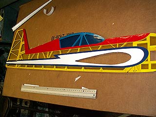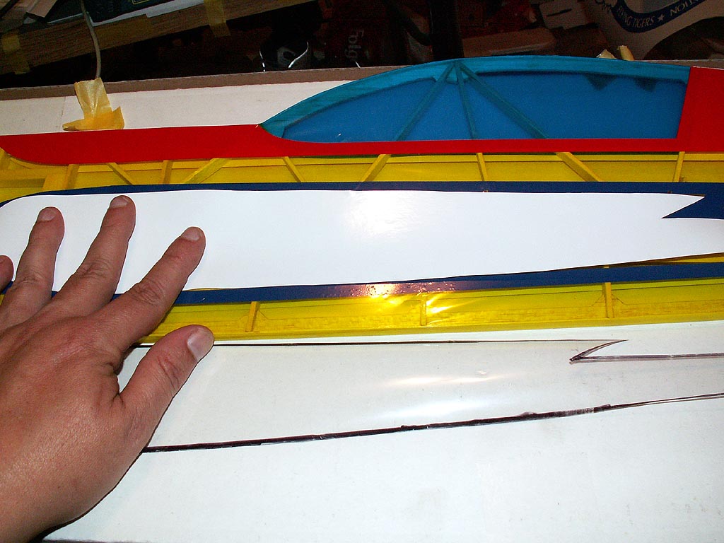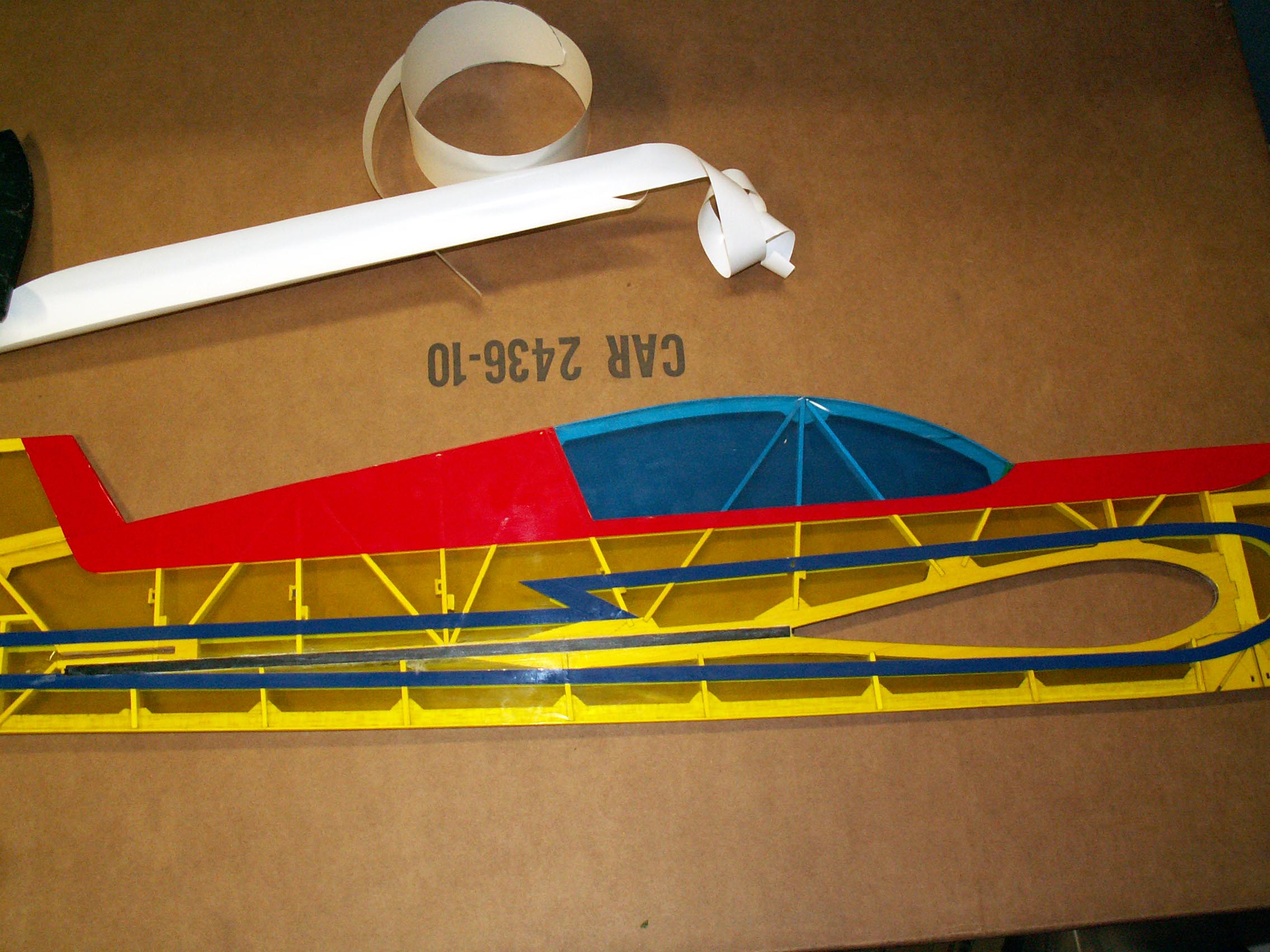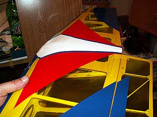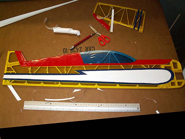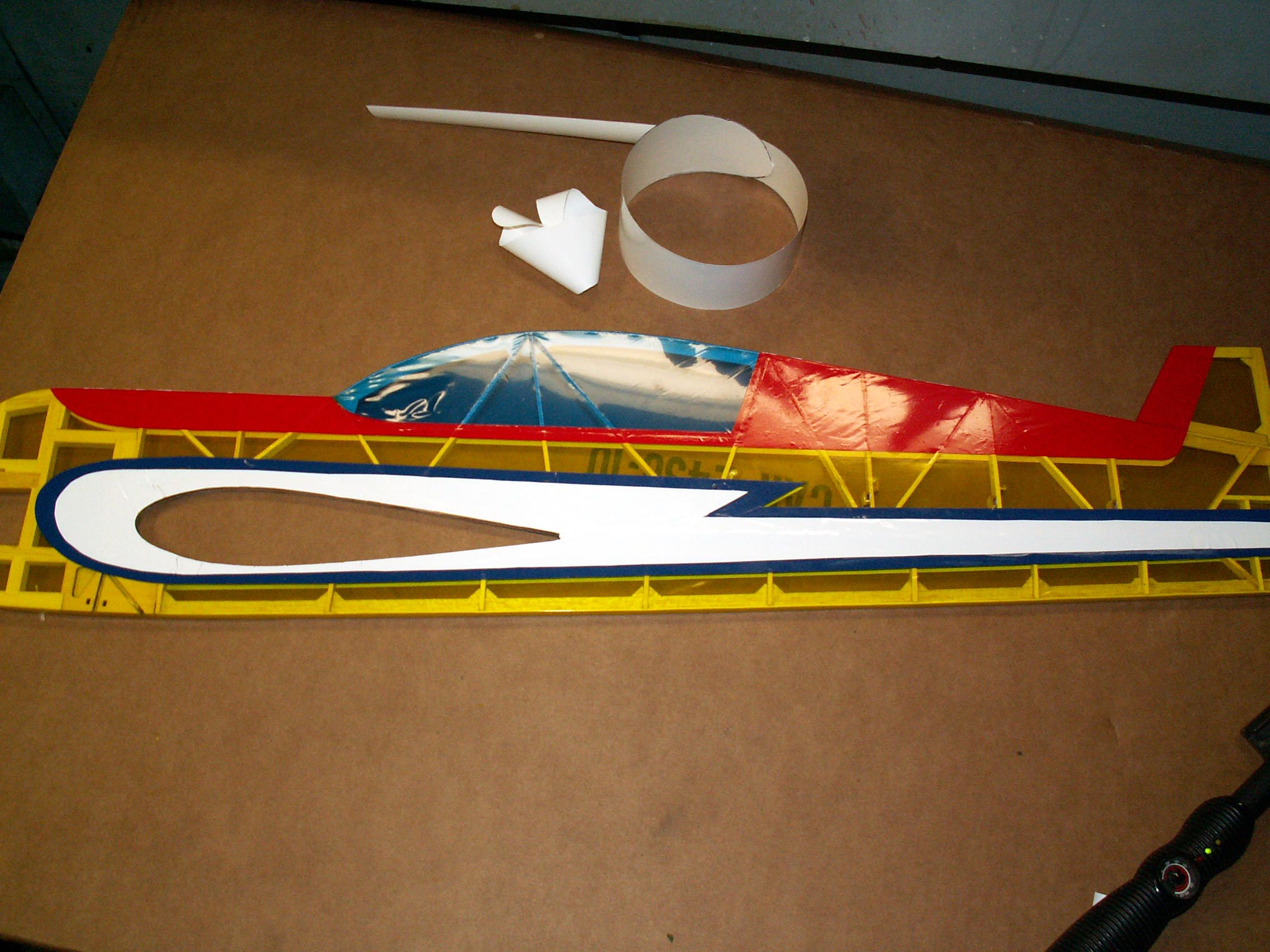 Assembly went fairly well. Quique's larger Yak's have white trim on the wing and fuselage... which really makes the colorscheme "pop". So, I added it to mine... regular ultracote white. The rest of the covering is probably "China-Kote". The yellow transparent is thicker than Ultracote-lite... and thicker than the covering that is on my EF Yak (same chinese factory made both planes). This yellow also seems to have memory... removing twists result in the twists returning in a couple days. The yellow also doesn't seem to want other covering sticking to it. When I installed the white trim, I noticed the blue and red trim was loose (not attached well) in several places. So, I went over all the trim with the iron on about 195F. Not enough to shrink it, but plenty to seemingly activate the adhesive. However, in a few days the trim was loose again. I recommend trim sealent.